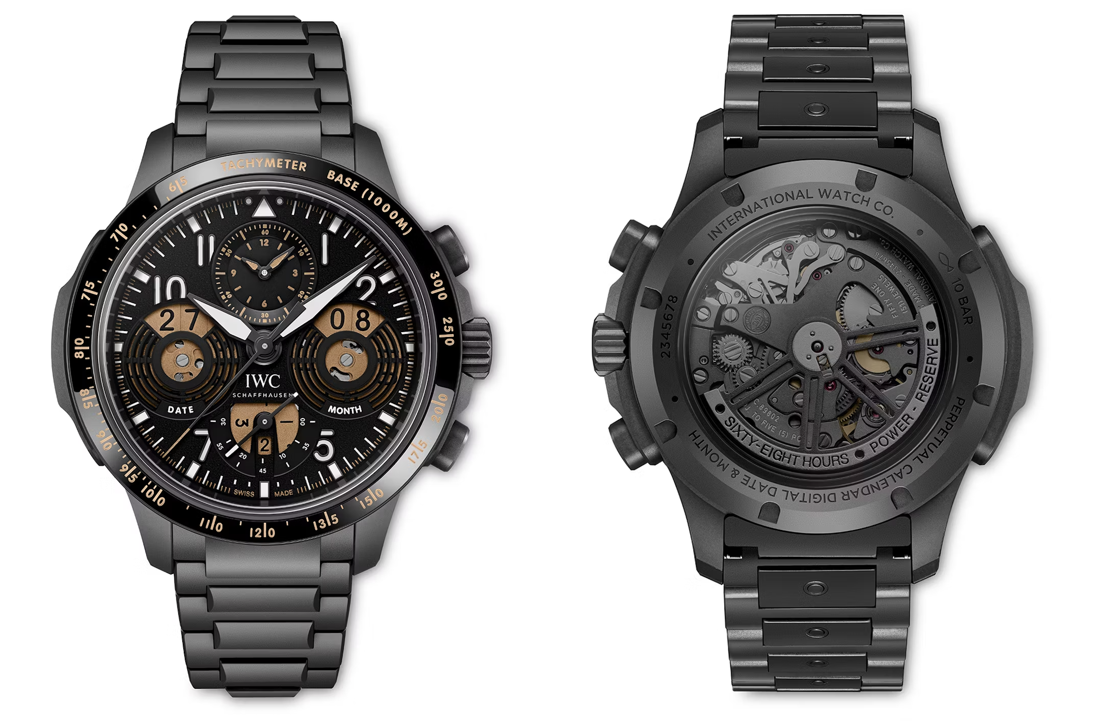 This intricate timepiece merges IWC’s Performance Chronograph architecture with a full Ceratanium build — covering the case, crown, pushers, and bracelet. Inside beats the in-house 89802 caliber, which integrates a perpetual calendar featuring digital displays for both the date and month. At 12 o’clock, there’s a combined chronograph register that tracks both hours and minutes, along with a traditional time display and small seconds. All of these functions are housed in a 43mm-wide, 16.5mm-thick case topped with a ceramic bezel.
