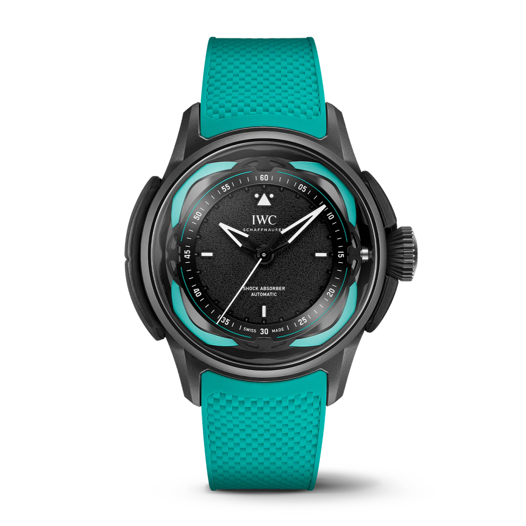 The case of the watch is made from IWC's innovative Ceratanium®, a material that combines the lightweight and durability of titanium with the hardness of ceramic. The black dial features a textured finish and triangular black hands, with Super-LumiNova® to improve legibility. The watch runs on IWC’s 32101 automatic calibre, offering a power reserve of 120 hours. The movement, which is blackened to complement the overall design, can be seen through a sapphire case back featuring Toto Wolff’s signature. The watch comes with a green rubber strap and includes an additional black rubber strap.